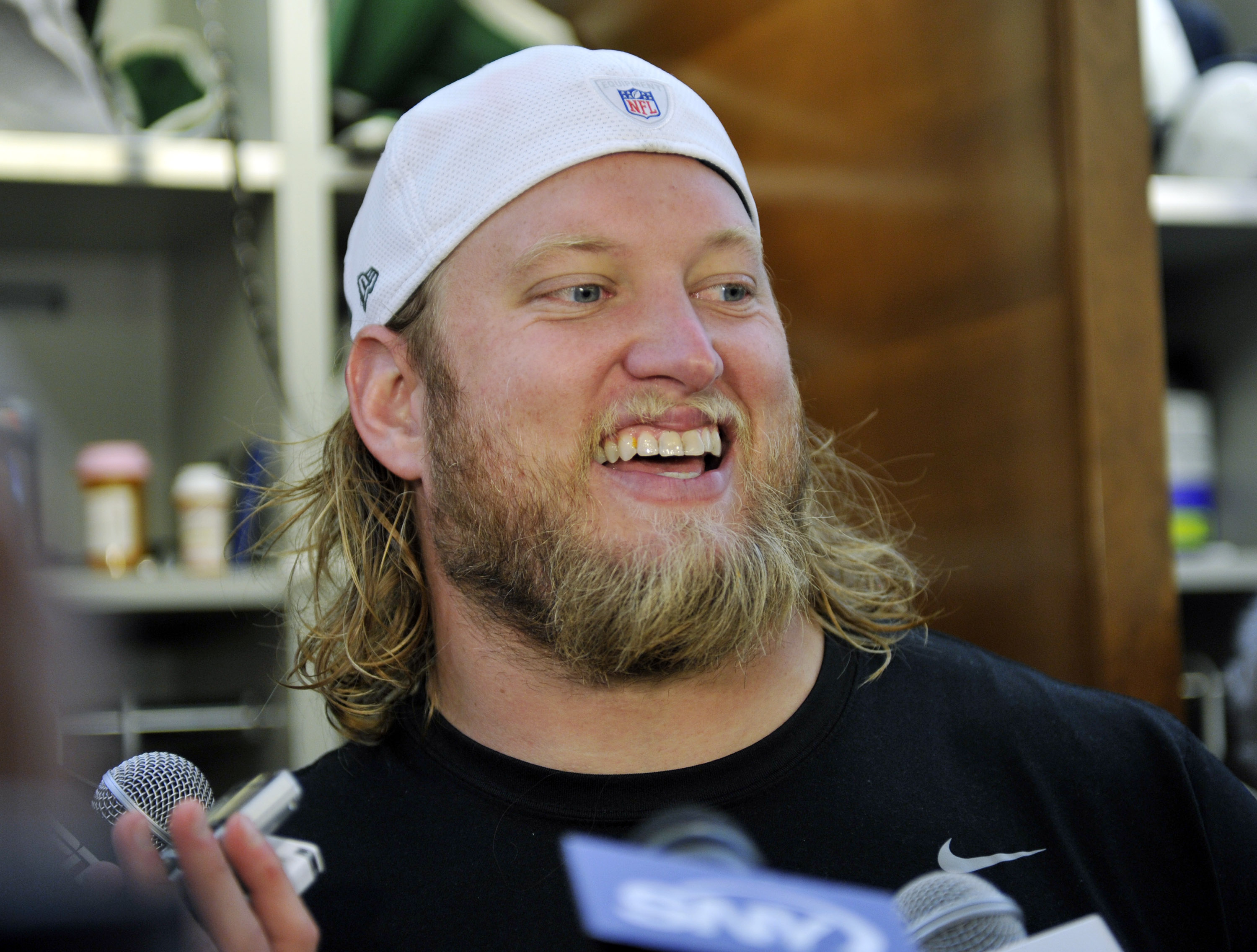 Jets center Nick Mangold speaking to the press shortly after arriving at New York Jets training camp in Florham Park, NJ. William Farrington