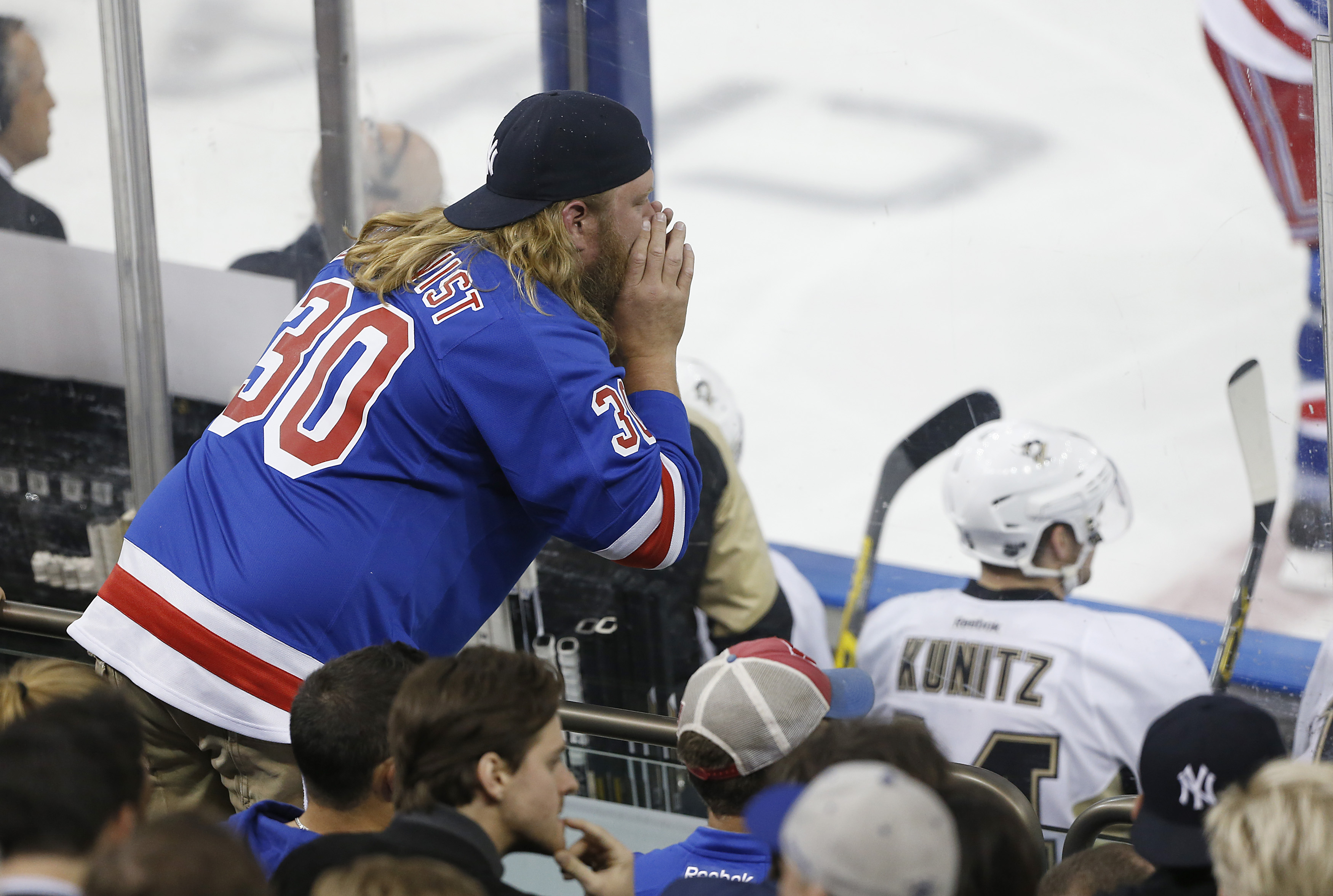 Nick Mangold poses with a young boy while taking a break from yelling at the Penguins bench during the third period of the Rangers game on April 19th, 2016. Anthony J. Causi / @ACausi