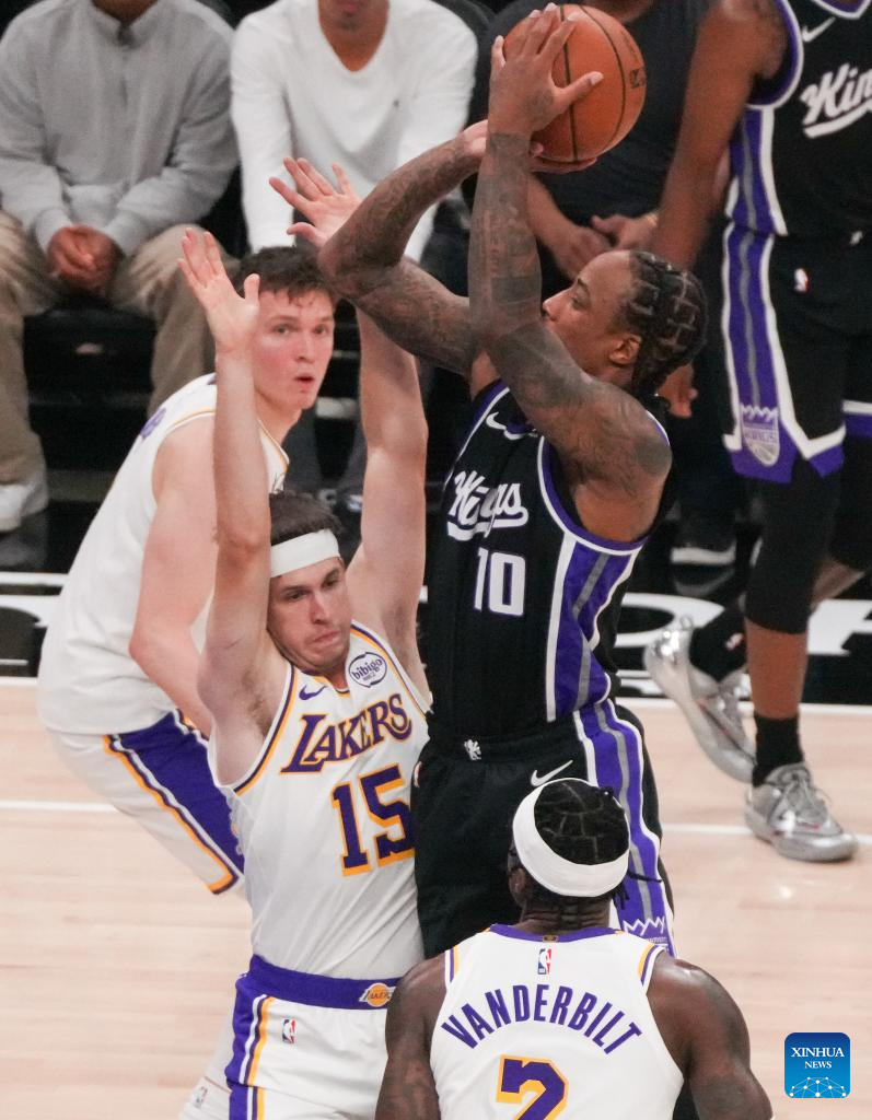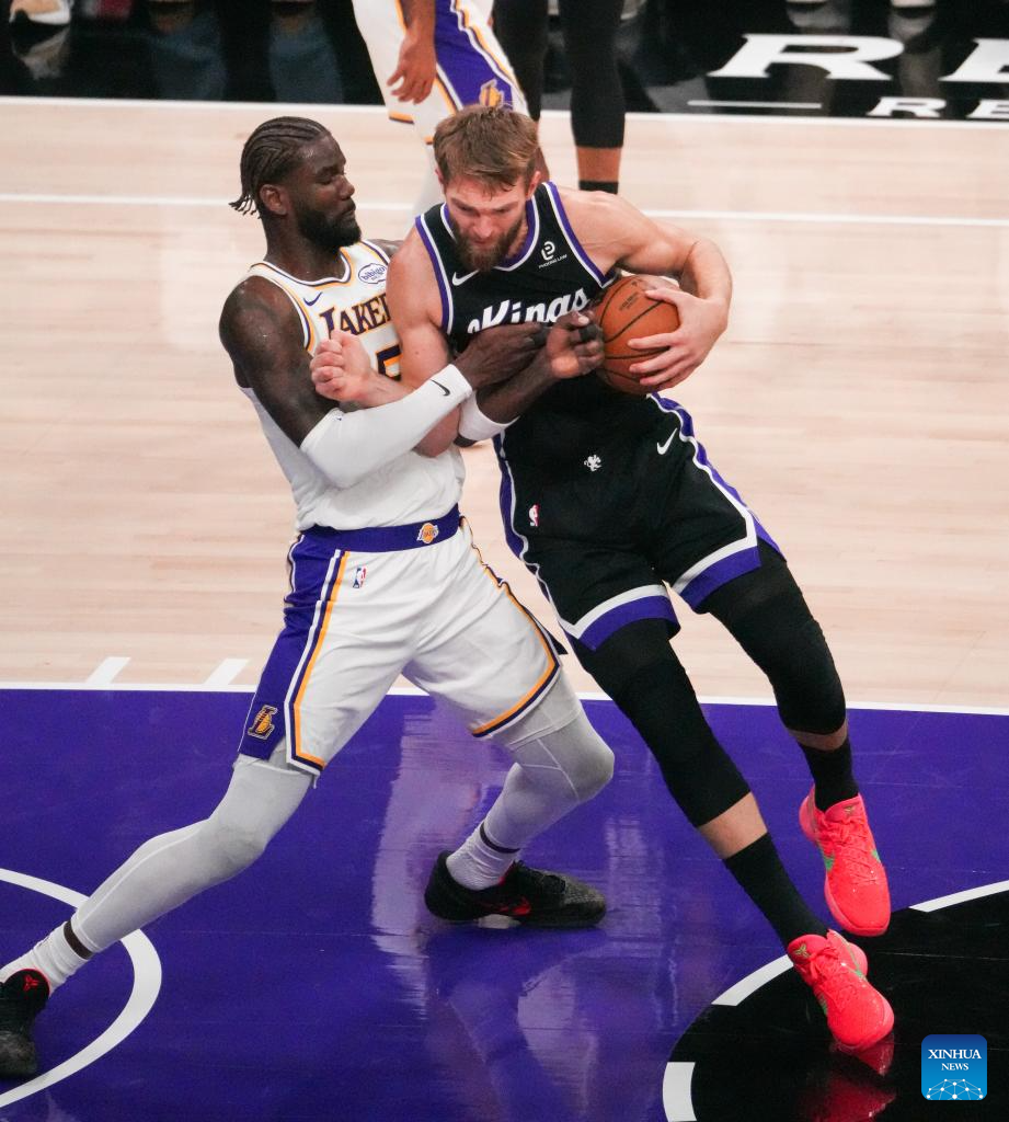 Jarred Vanderbilt (C) of Los Angeles Lakers competes during the 2025-2026 NBA regular season match between Sacramento Kings and Los Angeles Lakers in Sacramento, the United States, Oct. 26, 2025. (Photo by Sun Yuxuan/Xinhua)