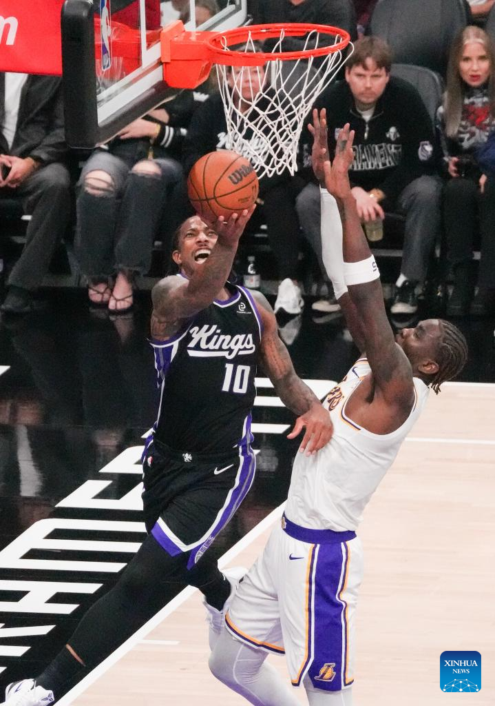 Zach LaVine (L) of Sacramento Kings goes for a lay-up during the 2025-2026 NBA regular season match between Sacramento Kings and Los Angeles Lakers in Sacramento, the United States, Oct. 26, 2025. (Photo by Sun Yuxuan/Xinhua)