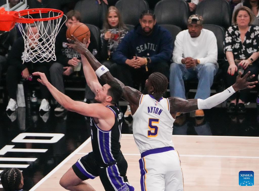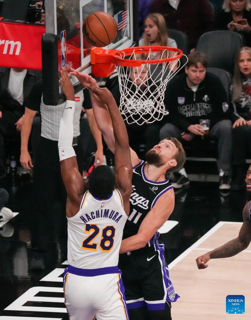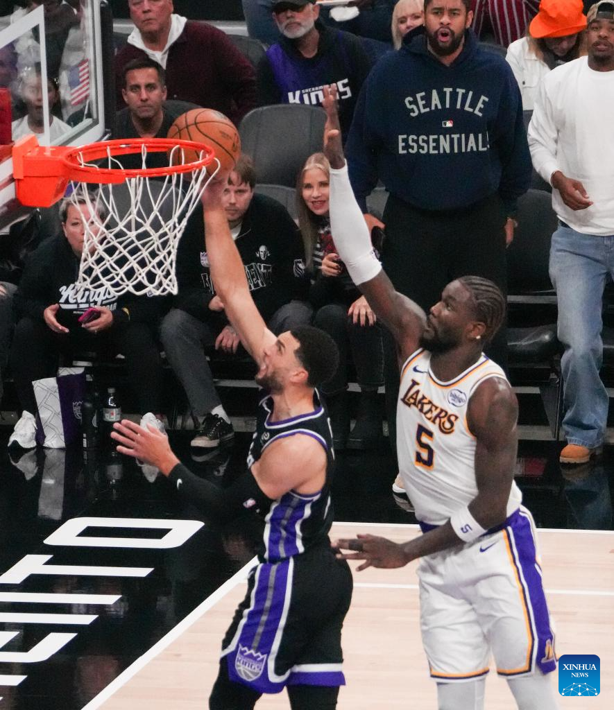 Domantas Sabonis (R) of Sacramento Kings competes during the 2025-2026 NBA regular season match between Sacramento Kings and Los Angeles Lakers in Sacramento, the United States, Oct. 26, 2025. (Photo by Sun Yuxuan/Xinhua)