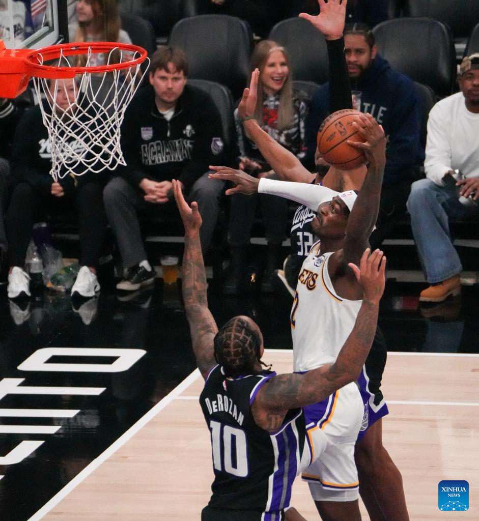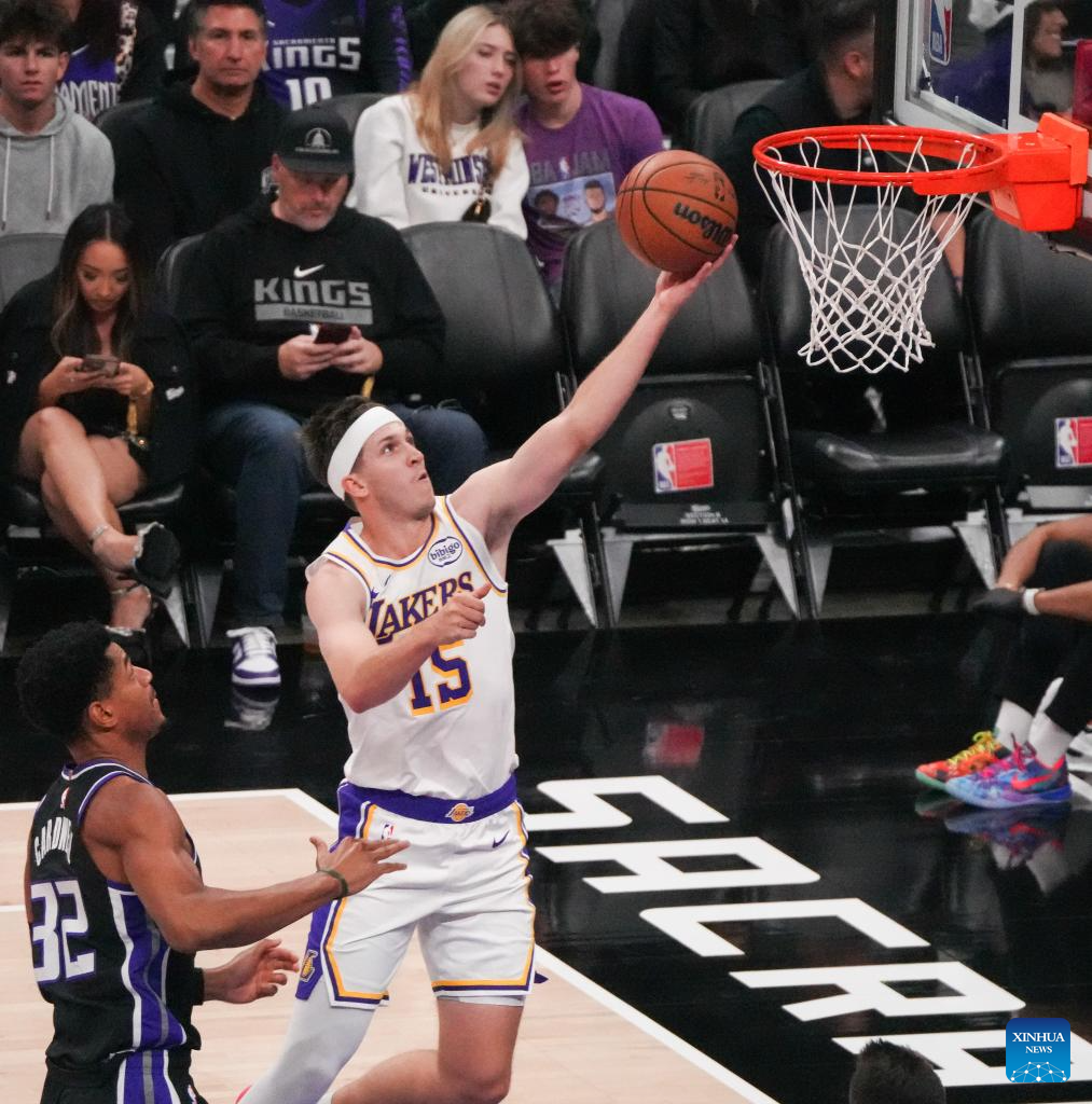 Los Angeles Lakers’ Austin Reaves (R) goes for a lay-up during the 2025-2026 NBA regular season match between Sacramento Kings and Los Angeles Lakers in Sacramento, the United States, Oct. 26, 2025. (Photo by Sun Yuxuan/Xinhua)