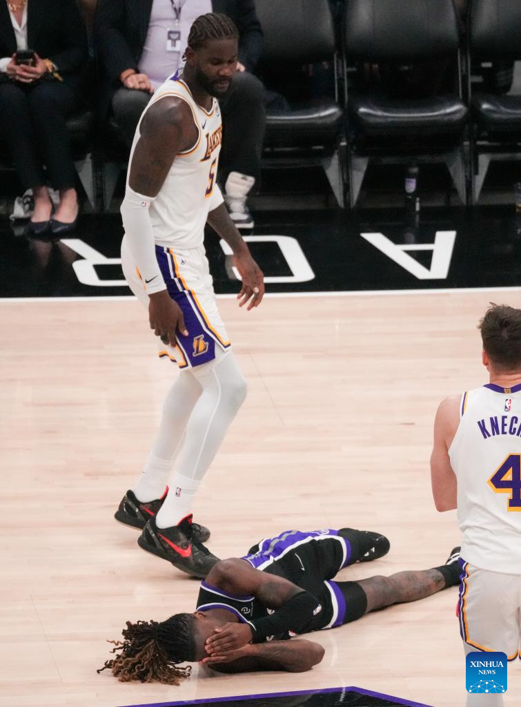 Keon Ellis (bottom) of Sacramento Kings falls down during the 2025-2026 NBA regular season match between Sacramento Kings and Los Angeles Lakers in Sacramento, the United States, Oct. 26, 2025. (Photo by Sun Yuxuan/Xinhua)