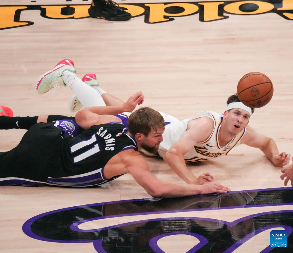 Los Angeles Lakers’ Austin Reaves (R) vies with Domantas Sabonis of Sacramento Kings during the 2025-2026 NBA regular season match between Sacramento Kings and Los Angeles Lakers in Sacramento, the United States, Oct. 26, 2025. (Photo by Sun Yuxuan/Xinhua)