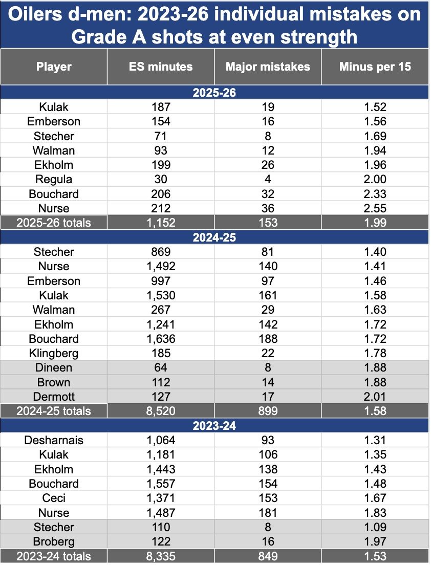 4. So far this year, Nurse has made nine major mistakes on goals against at even strength, Bouchard and Ekholm eight each. They’re all leaking Grade A shots at a higher rate than last year, and many of those errors are ending the worst possible outcome of a goal against.