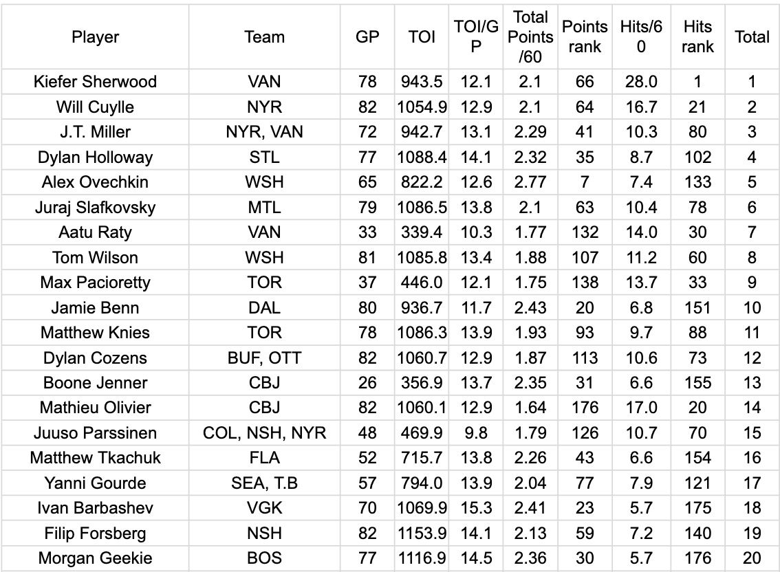 In the case of Sherwood, I love this notion, as Sherwood has worked his way up to become at age 30 a strong NHL power forward. In fact, if we rank regular NHL forwards on points per 60 and hits per 60 at even strength — giving equal weight to both categories, Sherwood was on top of the NHL last year, ahead of better known power forwards such as Tom Wilson, Alex Ovechkin, Matt Knies, Sam Bennett, and the Tkachuk brothers, Matthew and Brady.