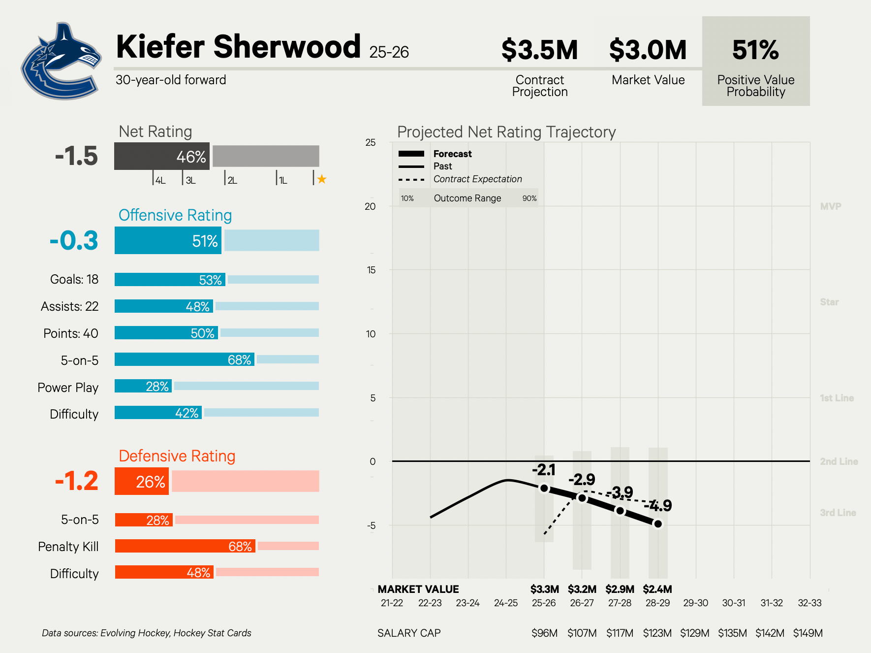 Evolving-Hockey’s model pointed to a three-year, $3.46 million extension this past summer. But with a rising cap, a thinning class of free agent wingers, Sherwood’s start, and the Canucks’ lack of forward depth, it makes for an even more interesting situation — especially if he can prove that he is more than just a bottom sixer this season.