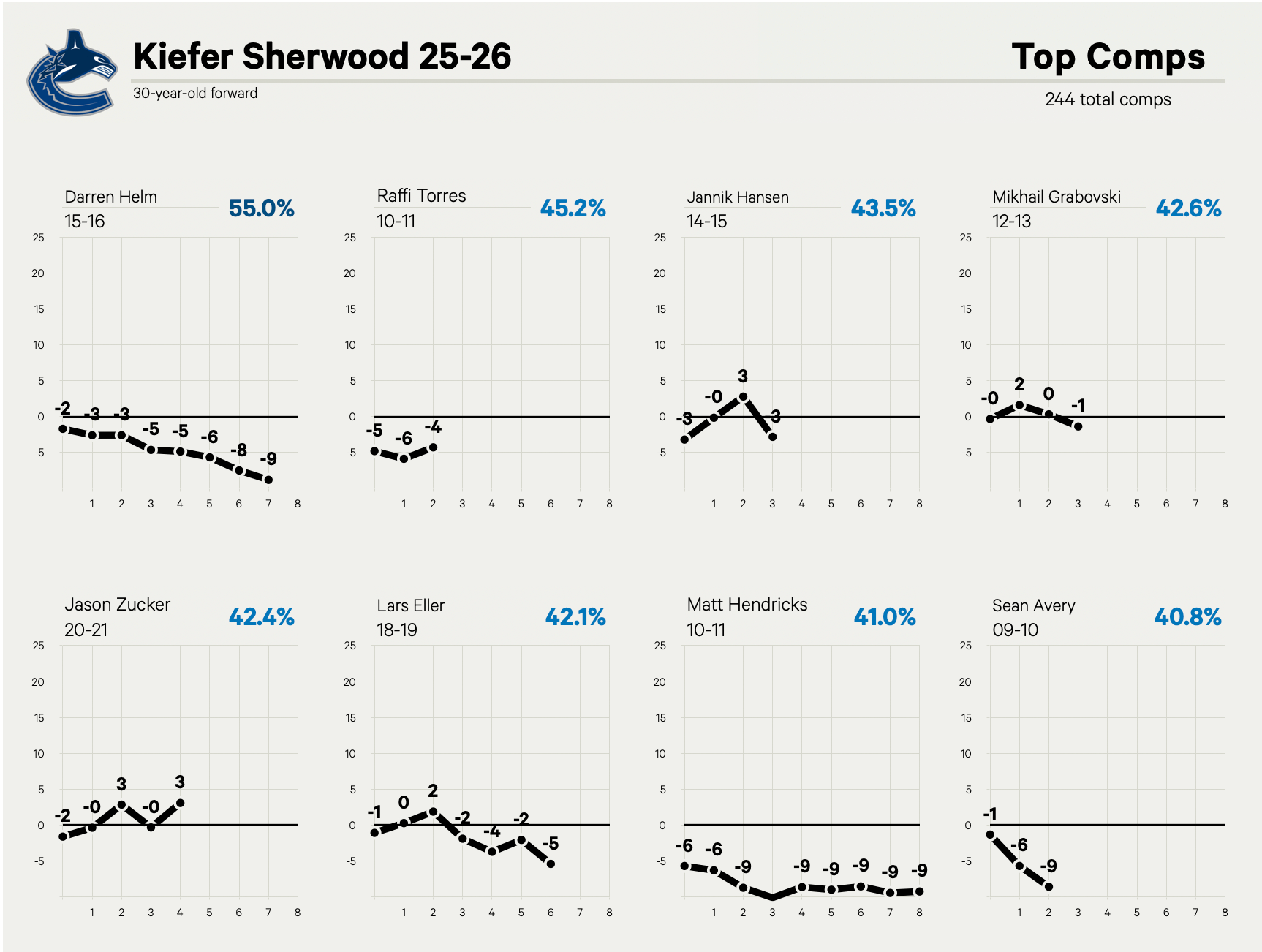 While Sherwood emerged as a spark plug in the early going of last season, with his goal-scoring and physicality, some sustainability concerns eventually slowed his production. His season-wide numbers left him with comps such as Darren Helm, Raffi Torres, Jannik Hansen and Mikhail Grabovski.