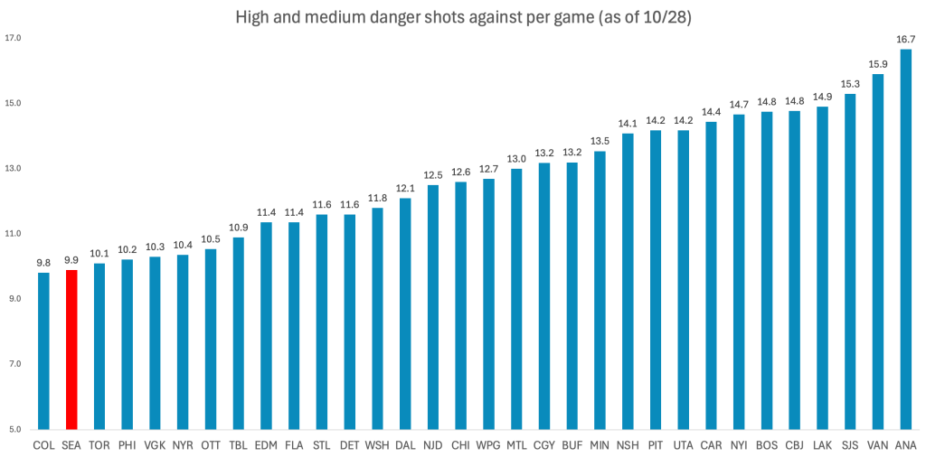 The Kraken have played a sound defensive game, focusing on limiting high- and medium-danger chances while allowing opponents to take low-danger shots. The coaching staff has done an excellent job getting the team to buy into this structure, and the results speak for themselves. One nitpick: even at 5-2-3, the Kraken have scored just 28 goals and have an even goal differential. Getting the offense rolling would elevate this team further, but their identity is clearly rooted in strong defensive play and structure.