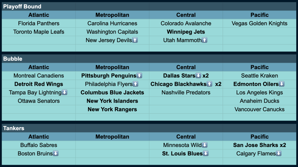 Central Division: Utah looks legit, scoring in bunches and remaining undefeated at home. That success forced a bit of a reshuffle, as having four teams from one division in the Playoff Bound tier this early felt excessive. Dallas slides down to the Bubble tier. Meanwhile, Minnesota and St. Louis have struggled out of the gate and move to the Tanker tier—not because they’ve given up, but because they’ve yet to find their rhythm.