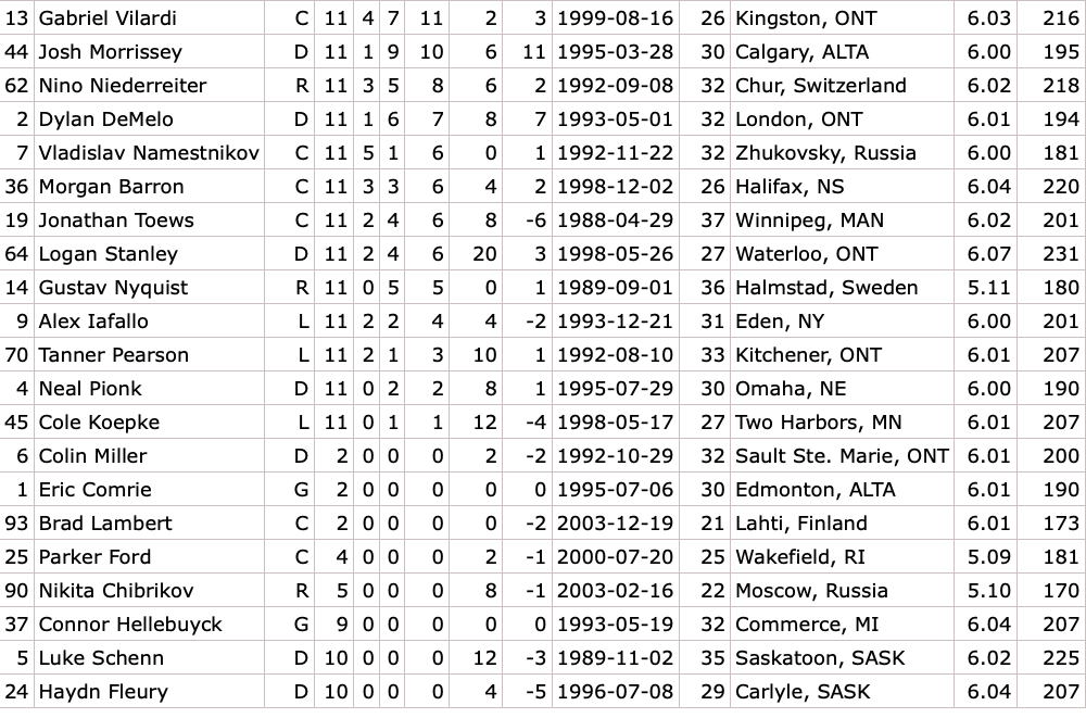 Scheifele went into Friday ranked second only to the Vegas Golden Knights’ Jack Eichel for the NHL points lead with 18 points (nine goals, nine assists) through the first 11 games of the season.Vilardi, who scored twice Thursday night against the Blackhawks, is also playing at a point-per-game pace (4-7—11). The Jets would love to see a breakout campaign from him after three straight 20-goal seasons led to his six-year extension in July.Former Chicago Blackhawks star Jonathan Toews made his comeback this season after missing the entirety of the 2023-24 and 2024-25 campaigns. He’s so far recorded six points (two goals, four assists) in what has so far been an impressive return as the Jets’ second-line center and a member of the second power-play unit.Reigning Hart and Vezina Trophy winner Connor Hellebuyck is once more off to a dominant start to his 11th NHL season. He’s so far posted a .921 save percentage and 2.34 goals against average, and the Jets boast a 6-3-0 record in his nine starts.