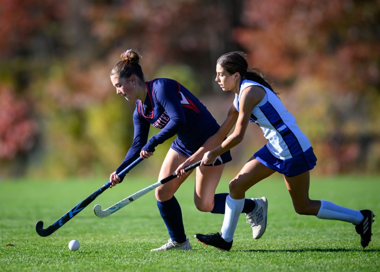Frontier Regional’s Nora Sloan, left, controls the ball against Stoneham during their field hockey game in Deerfield on Saturday, November 1, 2025. CHRISTOPHER EVANS/For the Gazette