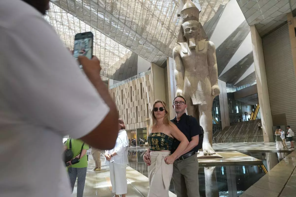 Tourists pose for a picture in front of the statue of Pharaoh Ramses II, at the Grand Egyptian Museum in Giza, Egypt, Friday, May 23, 2025. (AP Photo/Amr Nabil)