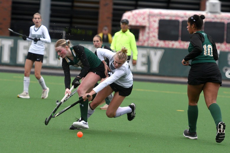 Woodstock’s Grace Perreault and Montpelier’s Regan Walke battle for the ball during the VPA D-III field hockey championship on Friday, Oct. 31, 2025, in South Burlington, Vt. Montpelier won, 2-1.