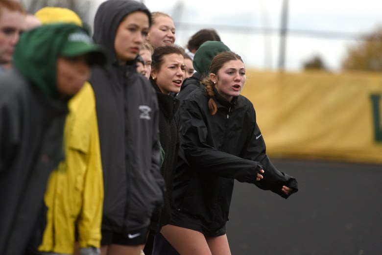 On a cold, wet afternoon, Woodstock players cheer for their team from the sidelines during the VPA D-III field hockey championship on Friday, Oct. 31, 2025, in South Burlington, Vr. Montpelier won, 2-1.