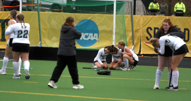After a double overtime, Woodstock’s Gwen Boudreau, Aleks Cirovic, and Joey Palazzo huddle together near the net after losing 2-1 to Montpelier in the VPA D-III field hockey championship on Friday, Oct. 31, 2025, in South Burlington, Vt.