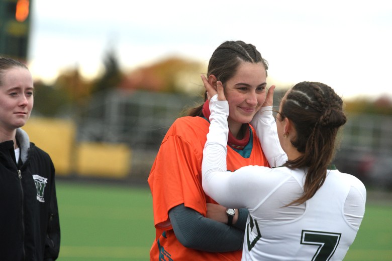 Woodstock’s Aleks Cirovic gives a smile to teammate and goalie Paige Stone after their loss to Montpelier in the VPA D-III field hockey championship on Friday, Oct. 31, 2025, in South Burlington, Vt. Montpelier won, 2-1.