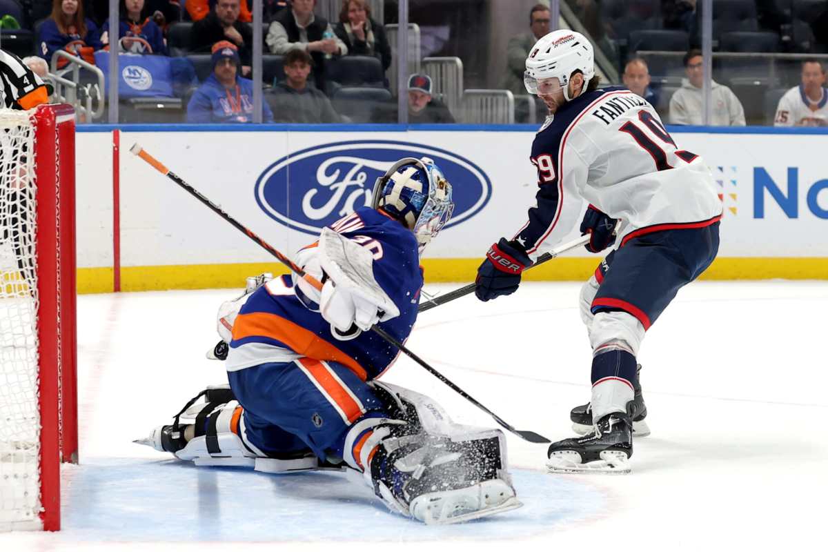 Mar 24, 2025; Elmont, New York, USA; Columbus Blue Jackets center Adam Fantilli (19) scores a goal past New York Islanders goaltender Ilya Sorokin (30) during the shootout at UBS Arena. Mandatory Credit: Brad Penner-Imagn Images