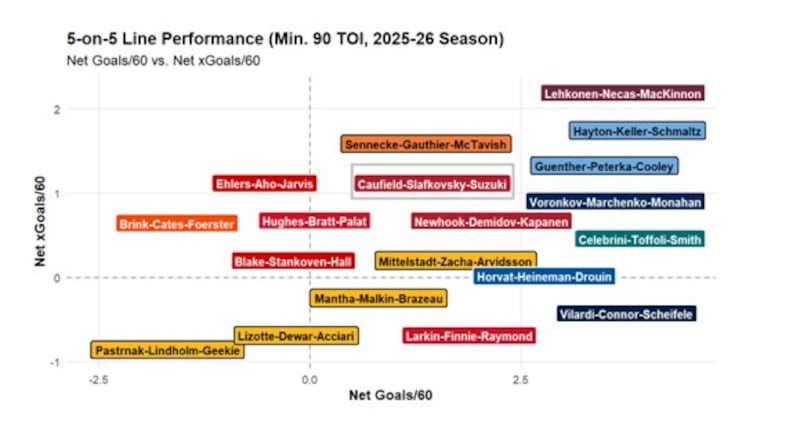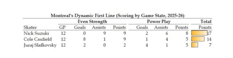 Montreal is off to a 9-3-0 start and carrying a +8 goal differential in the process. Last year, the team relied heavily on goaltending outperformance from Sam Montembeault (90.1 per cent stop rate; 31 goals saved versus expected). This year’s squad hasn’t nearly had the same goaltending goodness, but they have offset that through their top line of Nick Suzuki, Cole Caufield, and Juraj Slafkovsky.