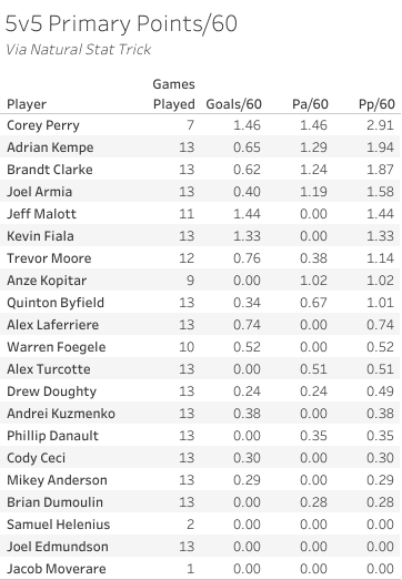 In his seven games overall, Perry leads the team in primary points/60 at 5-on-5.