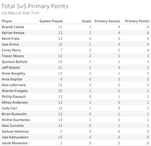 For the season, Clarke is tied for the team lead in primary points at 5-on-5.