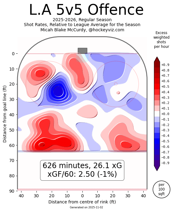 Over the last three games, according to Natural Stat Trick, LA was second in CF% but 17th in xGF%. Much of their preference still seems to be shots from the perimeter with traffic and hope for the best. The below from Hockey Viz shows a heavy amount of point shots and very little in the slot area. It’s a bit old-school, and it hasn’t exactly worked.