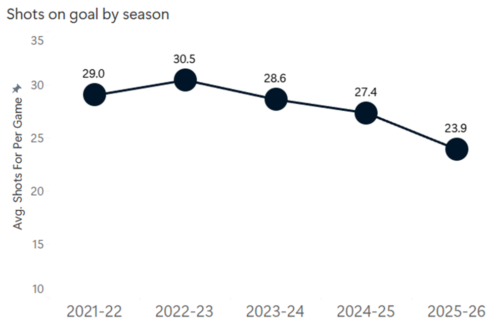 A big driver behind the lower scoring rate appears to be a lack of shot volume. The Kraken are averaging the fewest shots on goal per game in team history and currently sit dead last in the league in that category.
