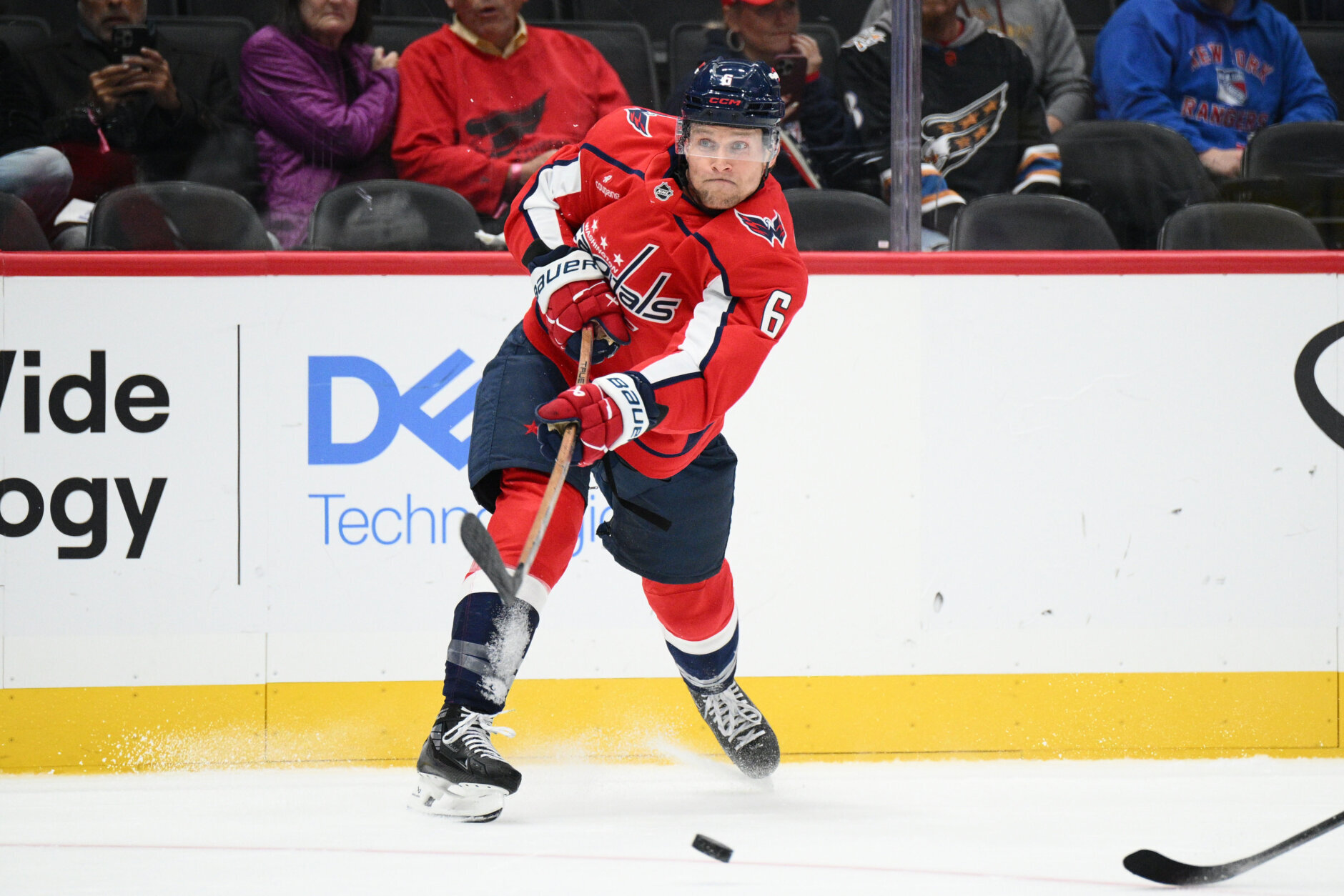 Islanders Capitals Hockey Washington Capitals defenseman Jakob Chychrun (6) shoots during the first period of an NHL hockey game against the New York Islanders, Friday, Oct. 31, 2025, in Washington. (AP Photo/Nick Wass)