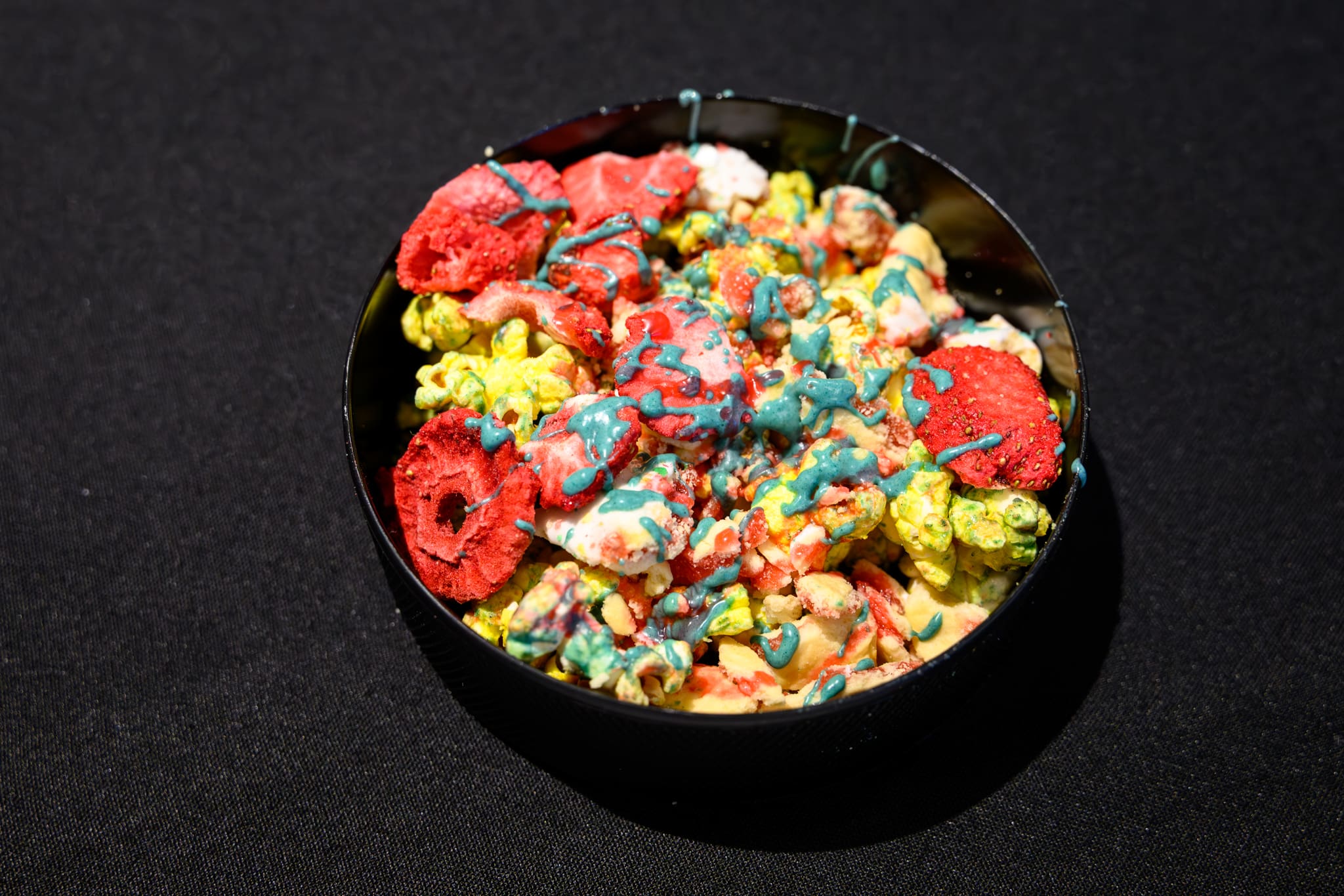 “This one set the tone for the evening: popcorn served in a “chum bucket” style, salted butter, plus dehydrated strawberries, blueberry icing, and a hint of strawberry Pop-Tart.”