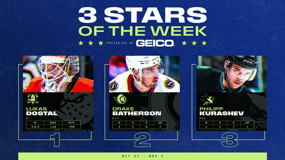 NEW YORK– Anaheim Ducks goaltender Lukas Dostal, Ottawa Senators right wing Drake Batherson and San Jose Sharks center Philipp Kurashev have been named the NHL’s “Three Stars” presented by GEICO for the week ending Nov. 2.