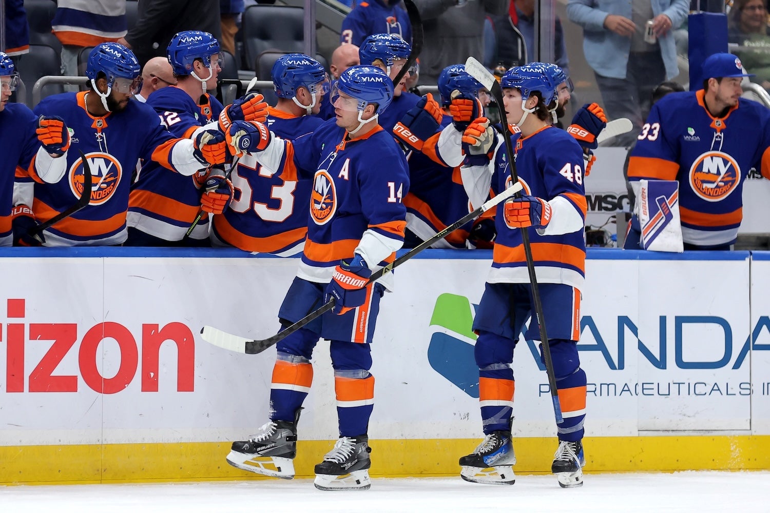Nov 4, 2025; Elmont, New York, USA; Islanders center Bo Horvat (14) celebrates his goal against the Bruins with teammates during the third period at UBS Arena. (Brad Penner-Imagn Images)