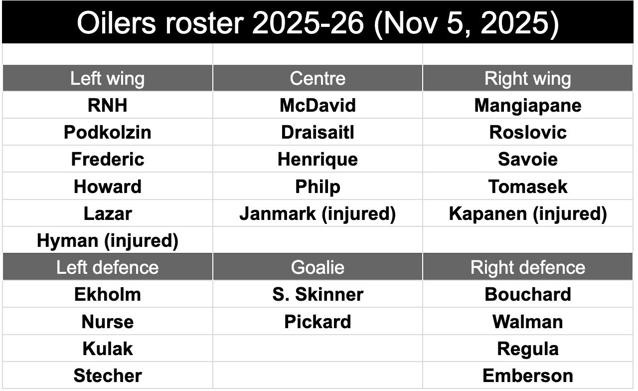2. The Oilers have a full 23 man roster going with Regula back. I can see Isaac Howard going to the American Hockey League with Hyman’s return, with the Oilers moving out one of Stecher or Emberson, with Lazar to the AHL with Kapanen’s return, and with Edmonton trying to either move Mattias Janmark ($1.45. million per year this year and next) or also send him to the AHL.