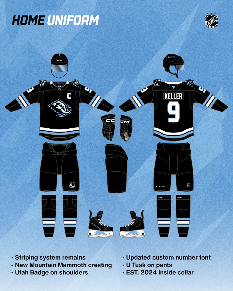 The Mammoth also gave fans a look at the team’s jersey designs as part of Wednesday’s announcement. Both the black home and white away jerseys retain the same striping patterns as the Hockey Club jerseys had. The home jersey features the Mountain Mammoth logo on the chest and the Utah Badge on the shoulders, while the white away jersey keeps the “UTAH” stairstep design—though in a new italicized font— down the front. Both also use a new custom block font for numbers and for captain’s letters.