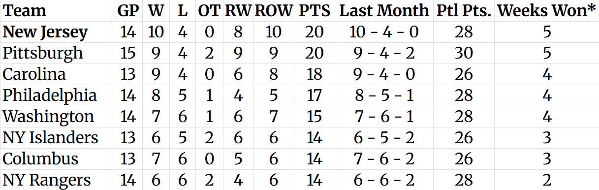 What Happened Last Month: The New Jersey Devils have managed injury after injury to make themselves the first team in the NHL to get to 10 wins. No, they do not have the most games played. The Penguins and several Western Conference teams have played 15 games, while the Boston Bruins have already played 16. Only the Colorado Avalanche have more points than the Devils, thanks to their five overtime losses. But the Devils were very close to not being the first team to 10 wins and very close to not being the first-place team in the Metropolitan today. As Jackson recapped last night, the Devils won a dramatic game against the Montreal Canadiens in overtime. Had they lost, the Penguins would be atop the Metropolitan Division, while the Canadiens would be the only team in the league with 10 wins. Thank you, Timo Meier and Jesper Bratt.