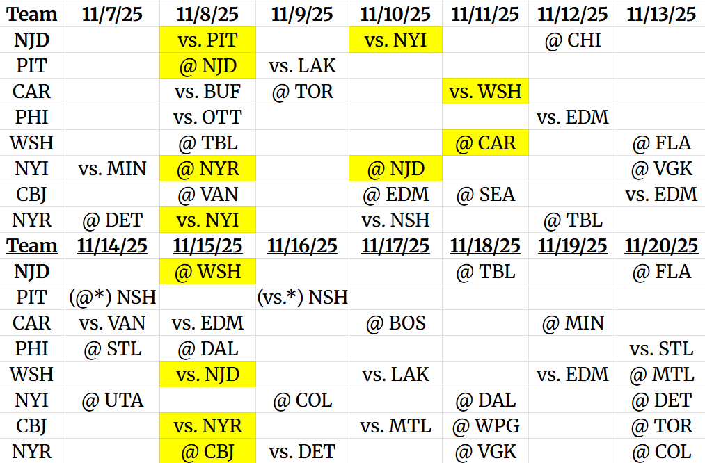 What’s Coming Up This Fortnight: Like the Capitals, the Islanders have a tough stretch ahead. They kick off a back-to-back tonight at home against the Wild before playing tomorrow night against the Rangers at the Garden. Then, they go to Newark on Monday night to play the Devils before going on a western road trip. They will face the Knights and Mammoth in a back-to-back before playing the Avalanche, Stars, and Red Wings the following week. Needless to say, they would probably be happy with a .500 points percentage in these two weeks, as their schedule lightens up with a long home stand afterwards.
