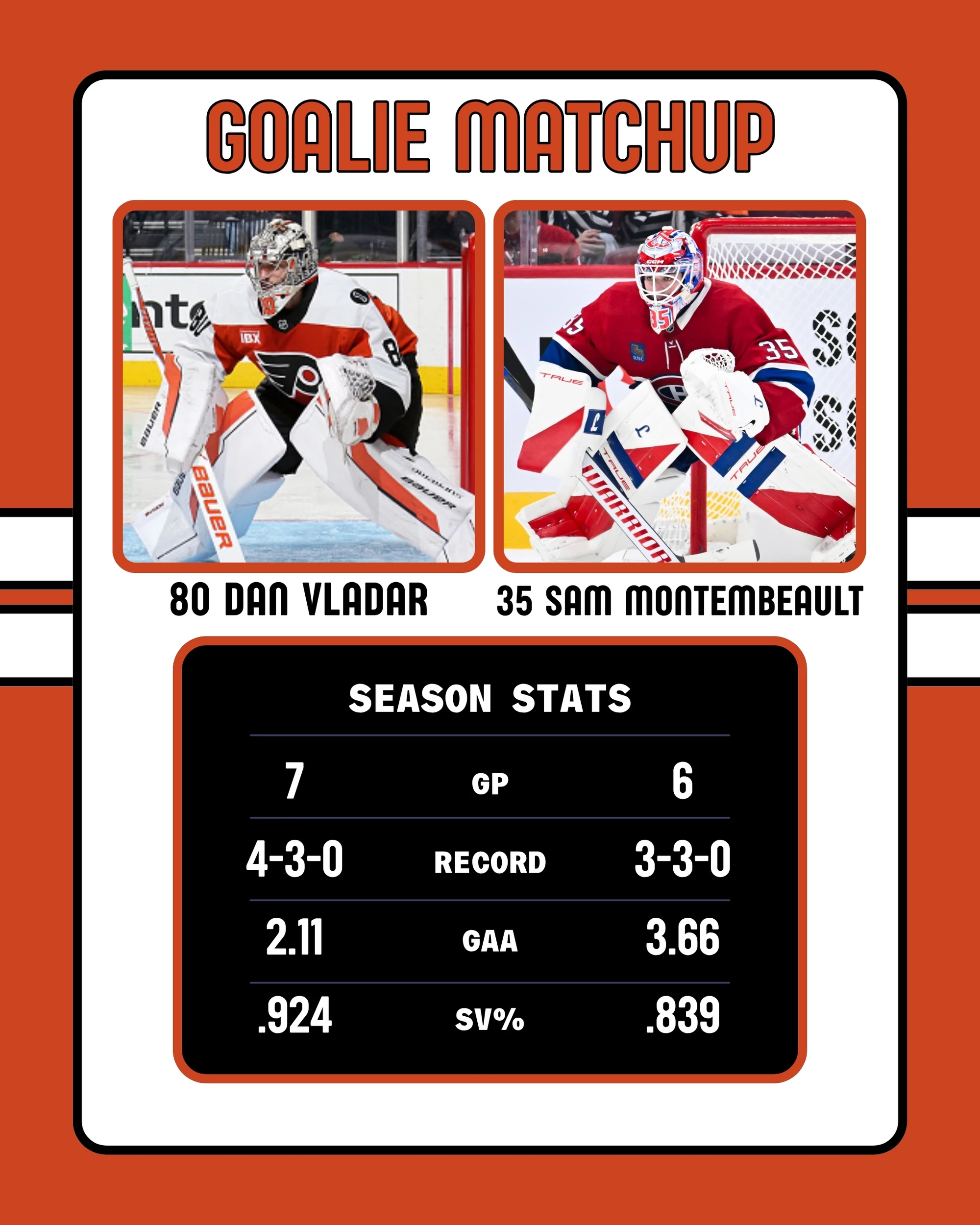Dan Vladar gets the start for the Flyers. Vladar was pulled in his last start after allowing four goals on 19 shots to Toronto on Saturday. Vladar had not allowed more than two goals in a game prior.
