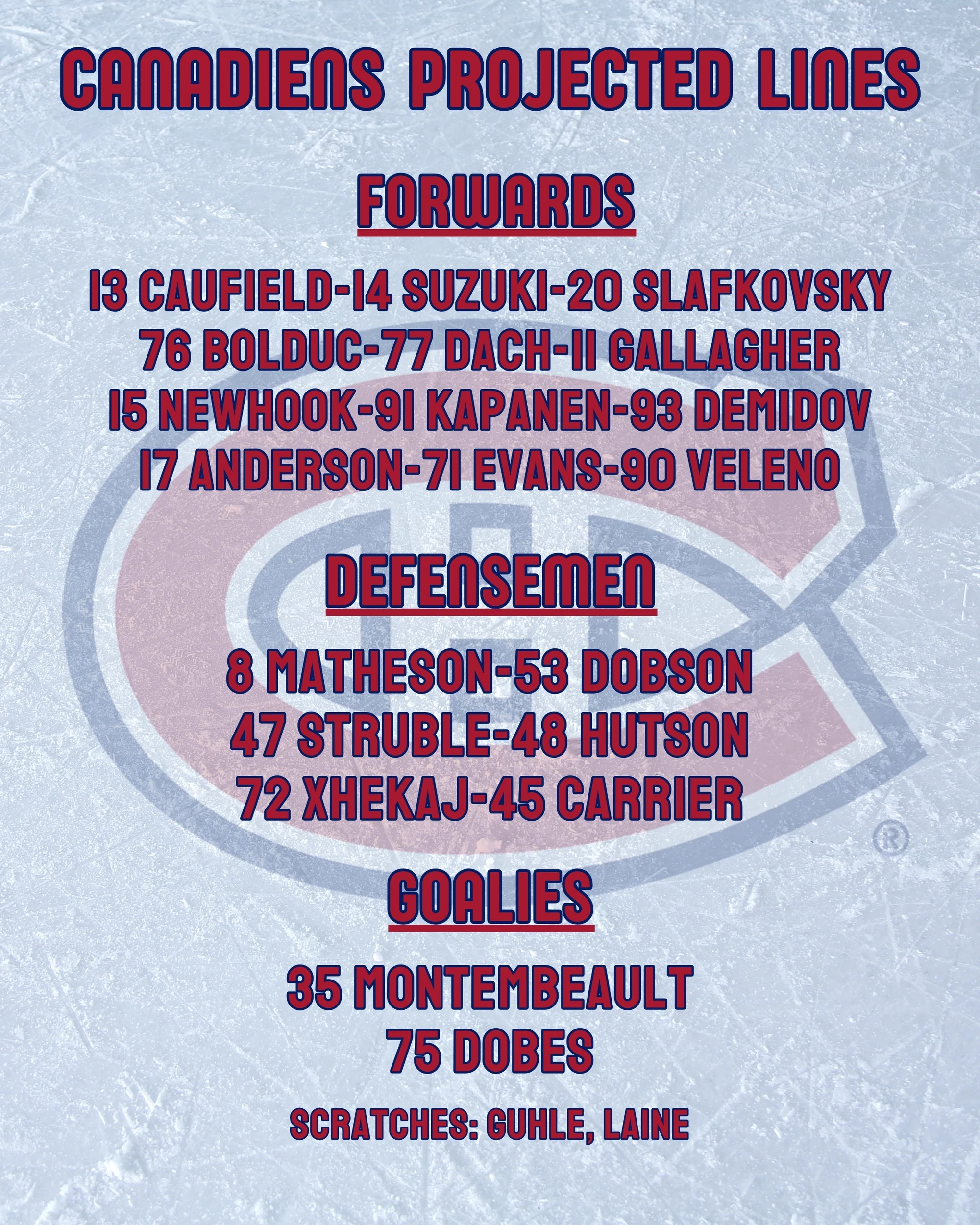 Canadiens: No changes are expected to the Montreal lineup.