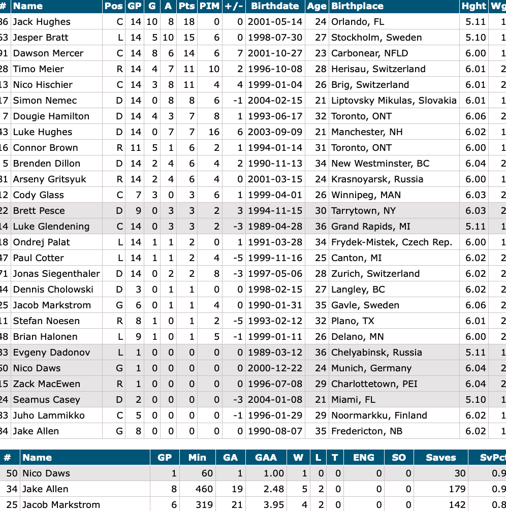 Jack Hughes looks like he’s back to his old self after recovering from the shoulder surgery that ended his 2024-25 season early. As of Friday, he’s tied for second in the NHL scoring race with 10 goals in his first 14 games of the season.Jesper Bratt is meanwhile on pace for his third straight point-per-game campaign with five goals and 10 assists.Jacob Markstrom has been inconsistent through this early stretch of the season, during which he’s missed some time due to injury. His stats are mostly marred by the eight goals he let in during an Oct. 28 blowout loss at the Colorado Avalanche.