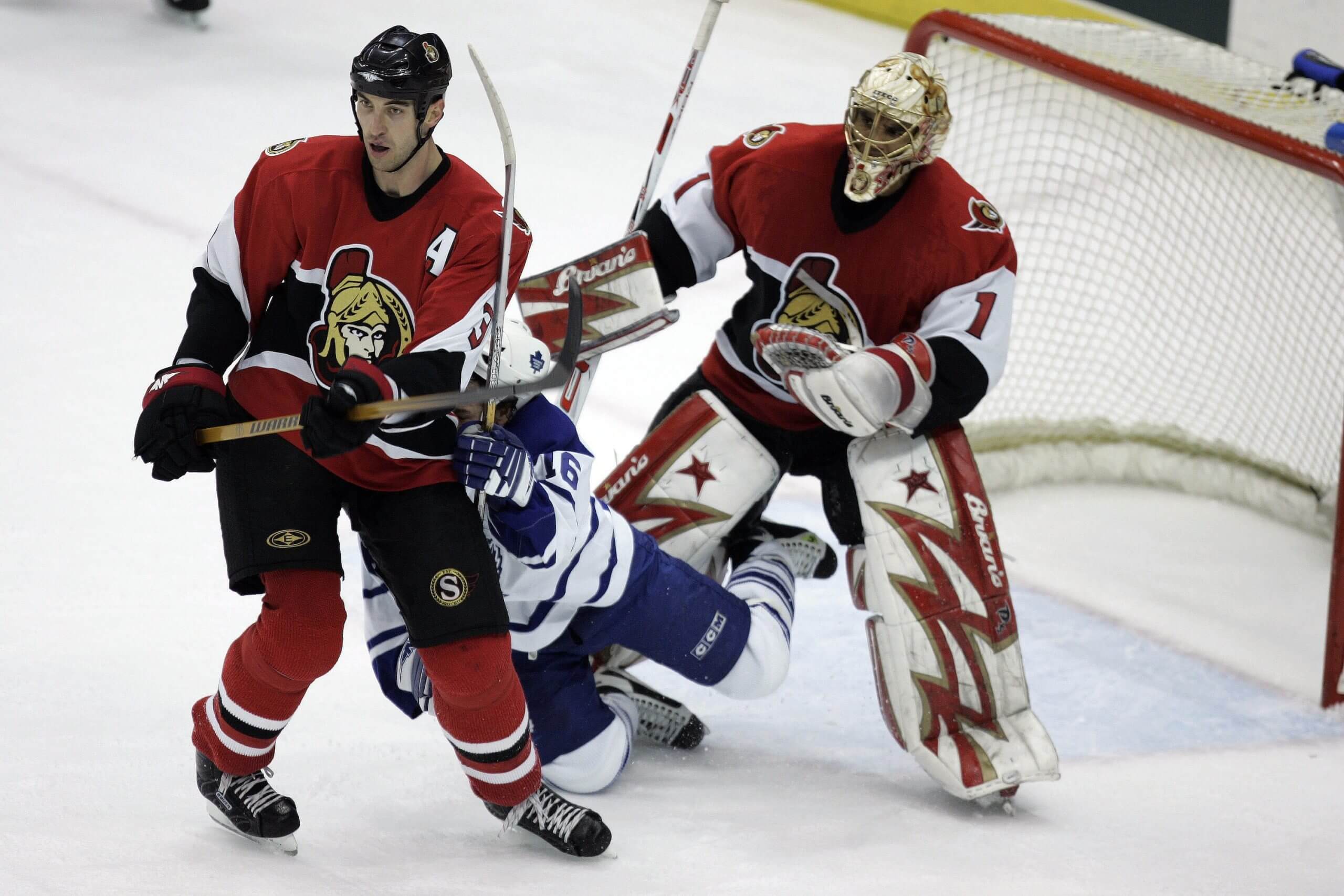 Chara, as a member of the Senators, in an April 2006 game alongside fellow teammate Ray Emery and Maple Leafs forward Darcy Tucker. (John Sokolowski / USA Today)