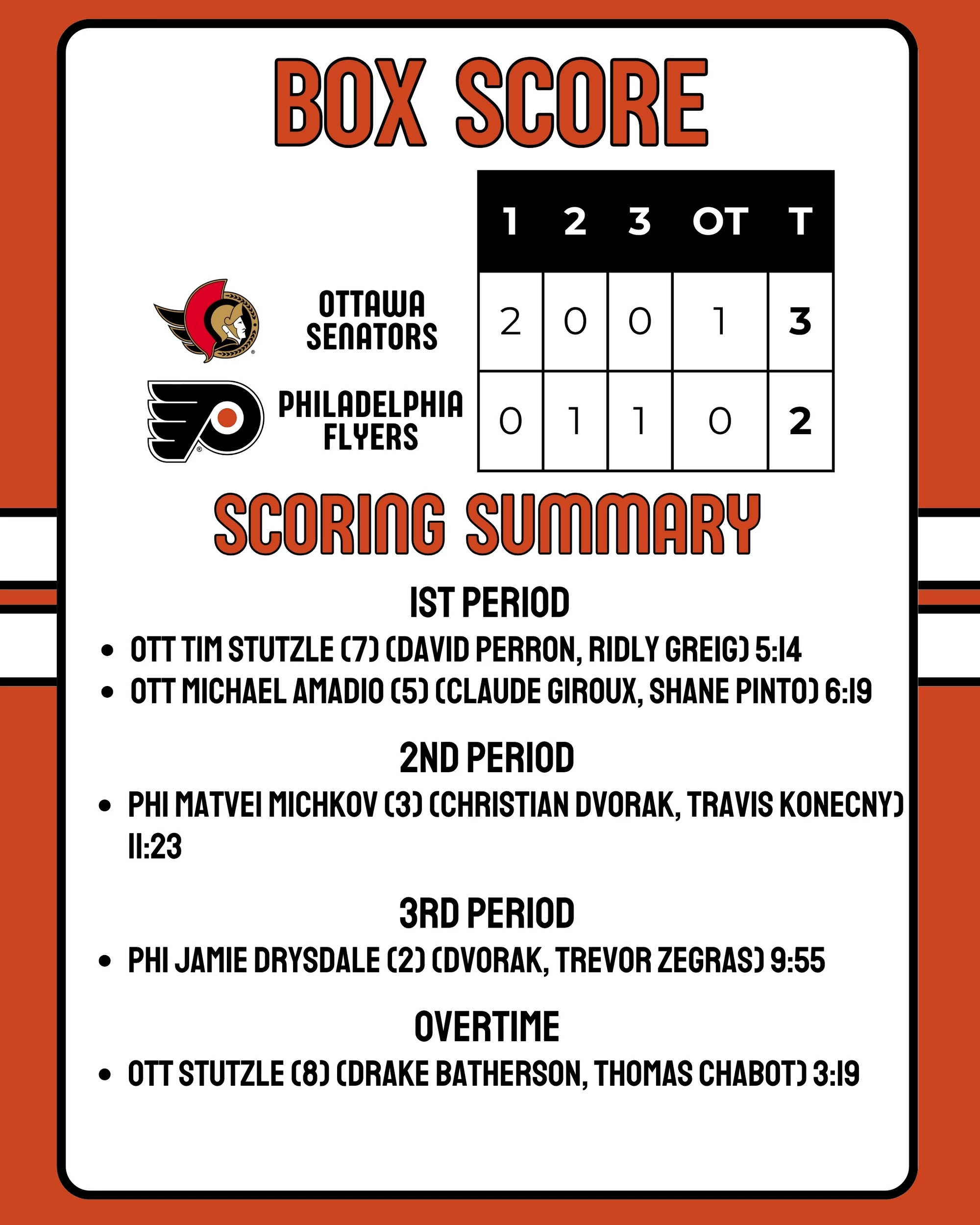 In the overtime, the Flyers allowed the first mistake to go the other way. A two-on-one for Ottawa ended with Stutzle being in perfect position for a tap-in, as the Senators grabbed the second point.
