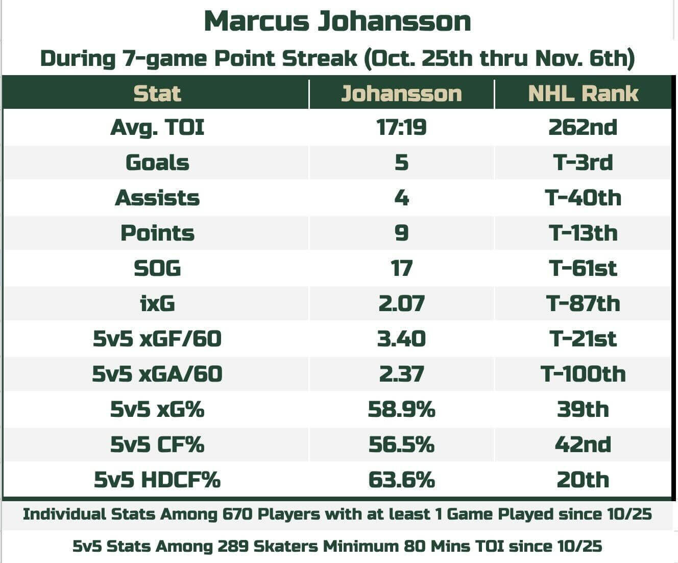 Johansson will appear in his 1,000th NHL game Sunday against the Calgary Flames, and he just so happens to be playing some of the best hockey of his career. He’s coming off a career-long eight-game points streak (five goals, five assists) with 14 points in 16 games. Johansson re-signing at one year, $800,000 over the summer didn’t make many waves, and even the veteran winger was expecting to play any role up and down the lineup. Now he’s one of the league’s best bargains.