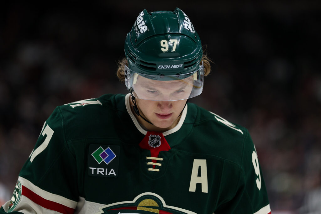 Oct 30, 2025; Saint Paul, Minnesota, USA; Minnesota Wild left wing Kirill Kaprizov (97) looks on during the second period against the Pittsburgh Penguins at Grand Casino Arena. Mandatory Credit: Matt Krohn-Imagn Images
