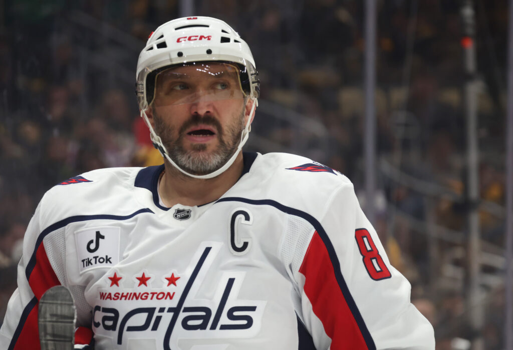 Nov 6, 2025; Pittsburgh, Pennsylvania, USA; Washington Capitals left wing Alex Ovechkin (8) looks on against the Pittsburgh Penguins during the second period at PPG Paints Arena. Mandatory Credit: Charles LeClaire-Imagn Images