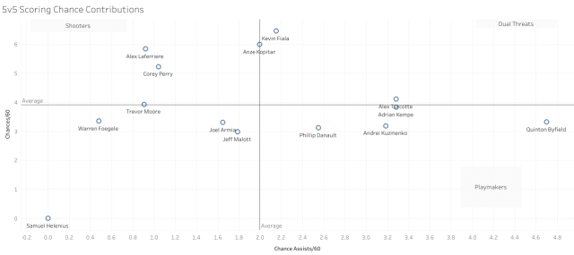 Turcotte leads the team in Shot Assists/60, is third in Shot Contributions/60, second in Chance Assists/60, and fourth in Chance Contributions/60. Clearly, there’s a creative, offensive player here.