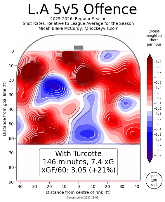 In the Shot and Scoring Chance Contribution tracking I’ve done, Turcotte continues to grade well as a chance generator.