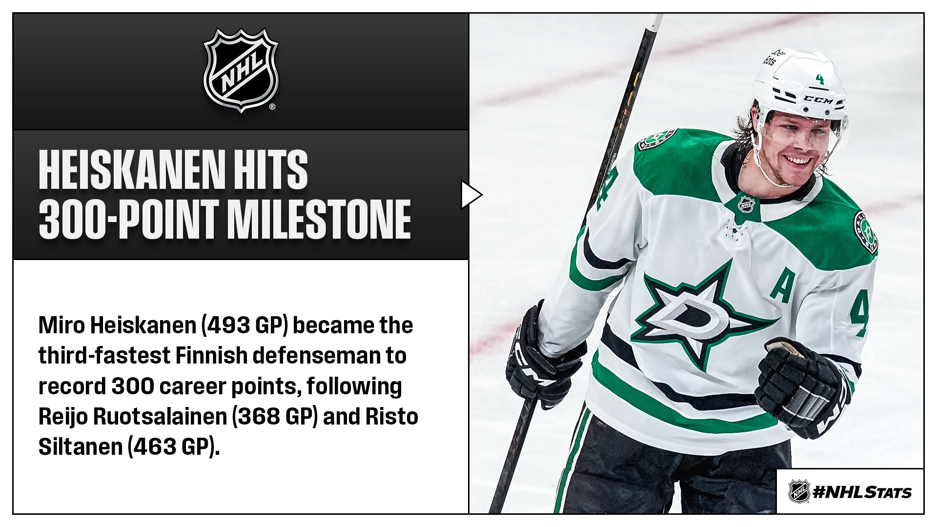 * Heiskanen surpassed Brad Maxwell (299) for the fifth-most points by a Stars/North Stars defenseman and became the ninth Finnish blueliner in NHL history to reach the 300-point mark.