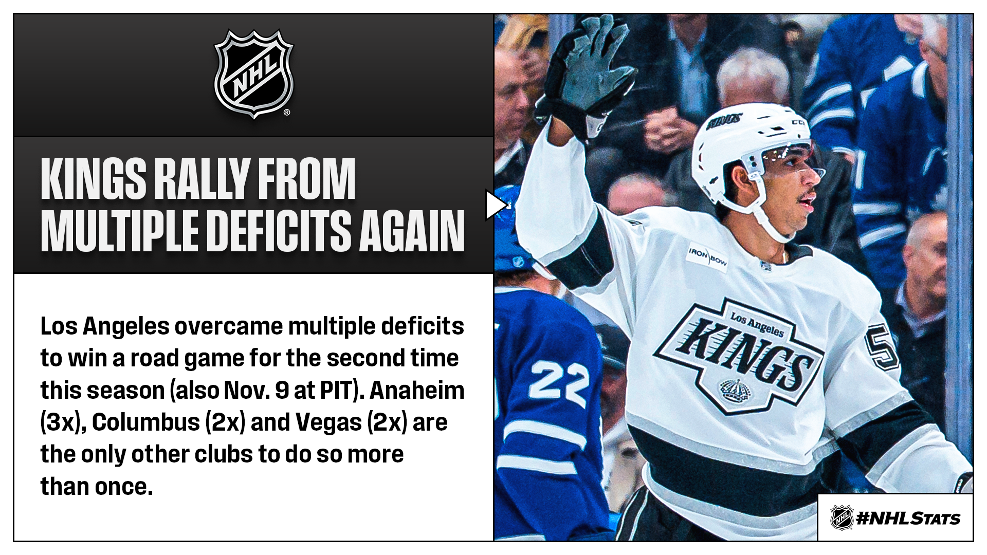 After the Maple Leafs jumped out to 2-0 and 3-2 leads, the Ontario-born trio of Quinton Byfield (1-1—2), Warren Foegele (1-0—1) and Drew Doughty (0-2—2) spearheaded a Kings rally that ended with an overtime victory at Scotiabank Arena. In the process, Los Angeles (7-0-2) extended its road point streak to nine games for the fifth time in the past 20 years and first since 2023-24 (11-0-1).