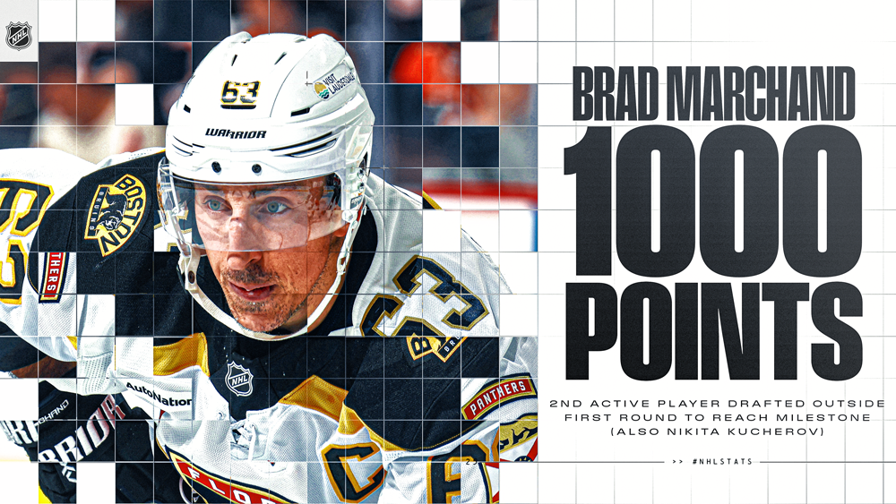 Brad Marchand (0-2—2) factored on two of Florida’s three third-period goals to boost his career totals to 435-565—1,000. He became the 12th active player to record 1,000 career points and joined Nikita Kucherov as the second active skater selected outside the first round of the NHL Draft to reach the milestone.
