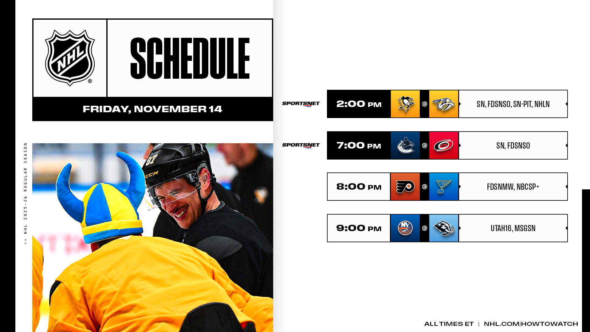 Friday’s four-game schedule starts with Sidney Crosby and the Penguins facing Filip Forsberg and the Predators during the 2025 NHL Global Series Sweden presented by Fastenal opener at Avicii Arena in Stockholm. The clubs are set to conclude their two-game set Sunday (9 a.m. ET on SN, NHLN, FDSNSO, SN-PIT).