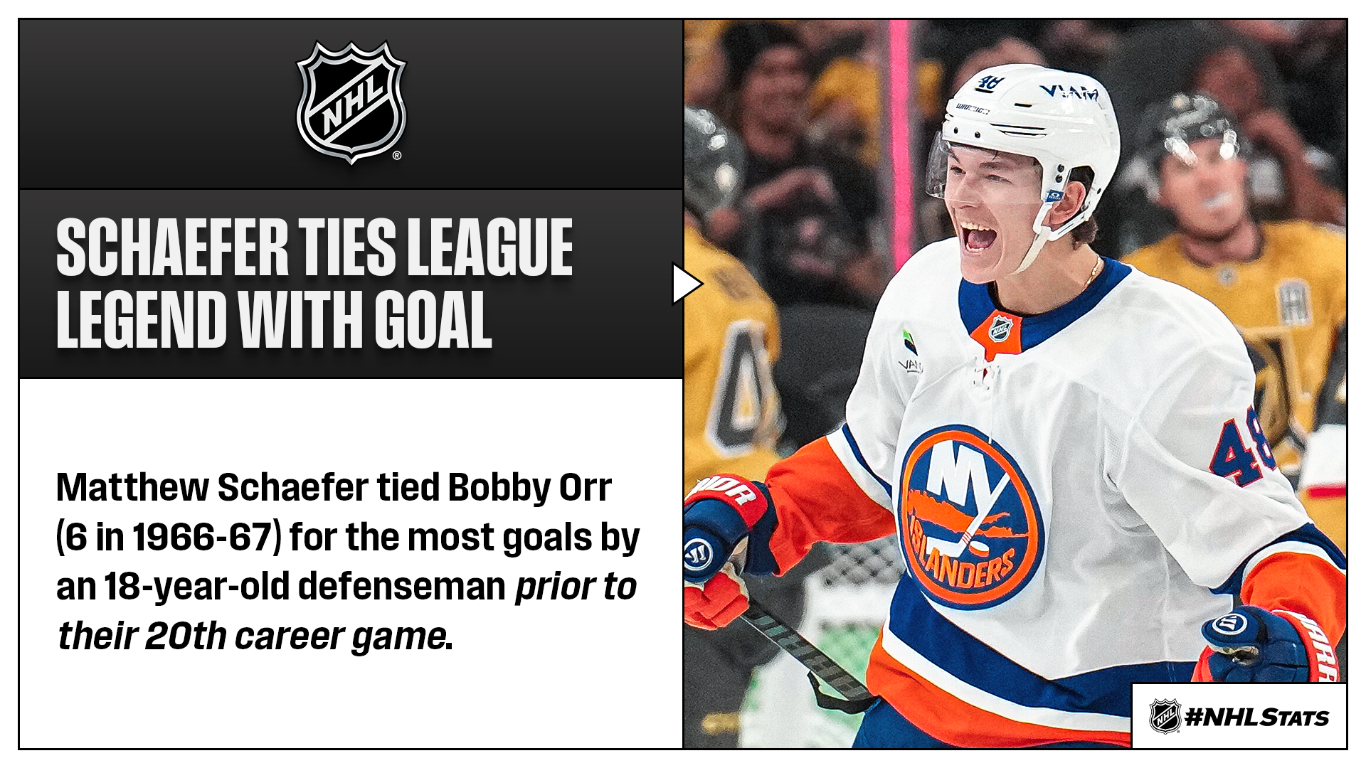 * Schaefer (1-1—2) factored on two goals, including an assist on the tying tally, to set the stage for Jean-Gabriel Pageau to lift the Islanders to victory with a shorthanded goal in overtime. Schaefer boosted his 2025-26 totals to 6-8—14 (17 GP), surpassing Bobby Orr (6-7—13 in 19 GP) to move into a tie with Ray Bourque (4-10—14 in 19 GP) for the second-most points by an 18-year-old defenseman prior to their 20th career game, trailing only Phil Housley (2-14—16 in 19 GP).